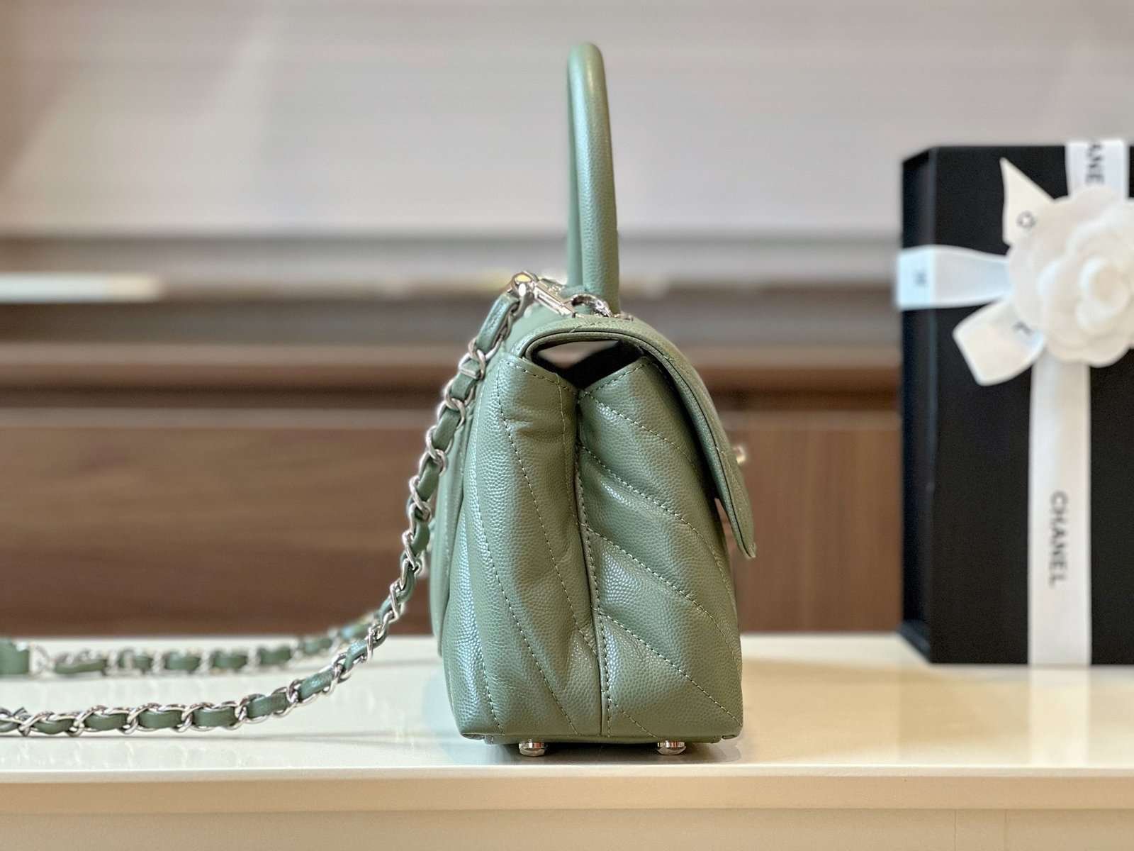 Chanel Coco V-shaped Pattern Replica 11 Handbag Green With Silver Lock 25cm - LuxuryRepBags