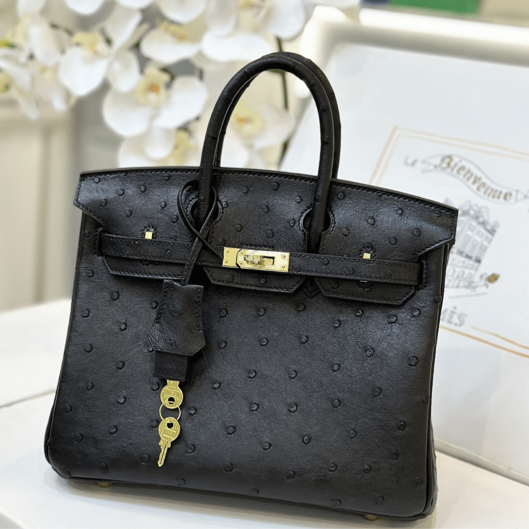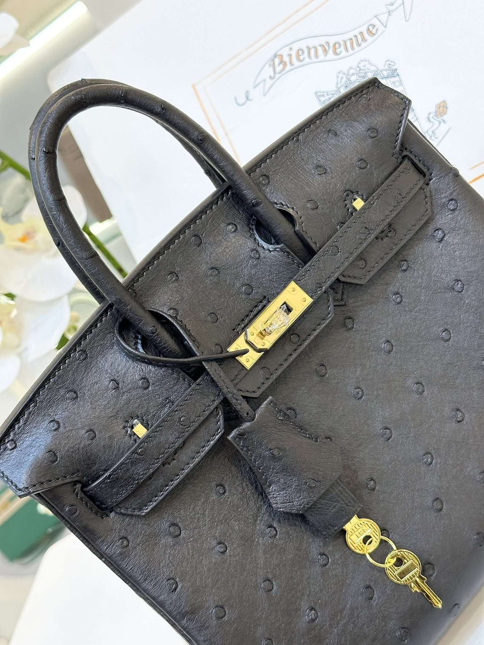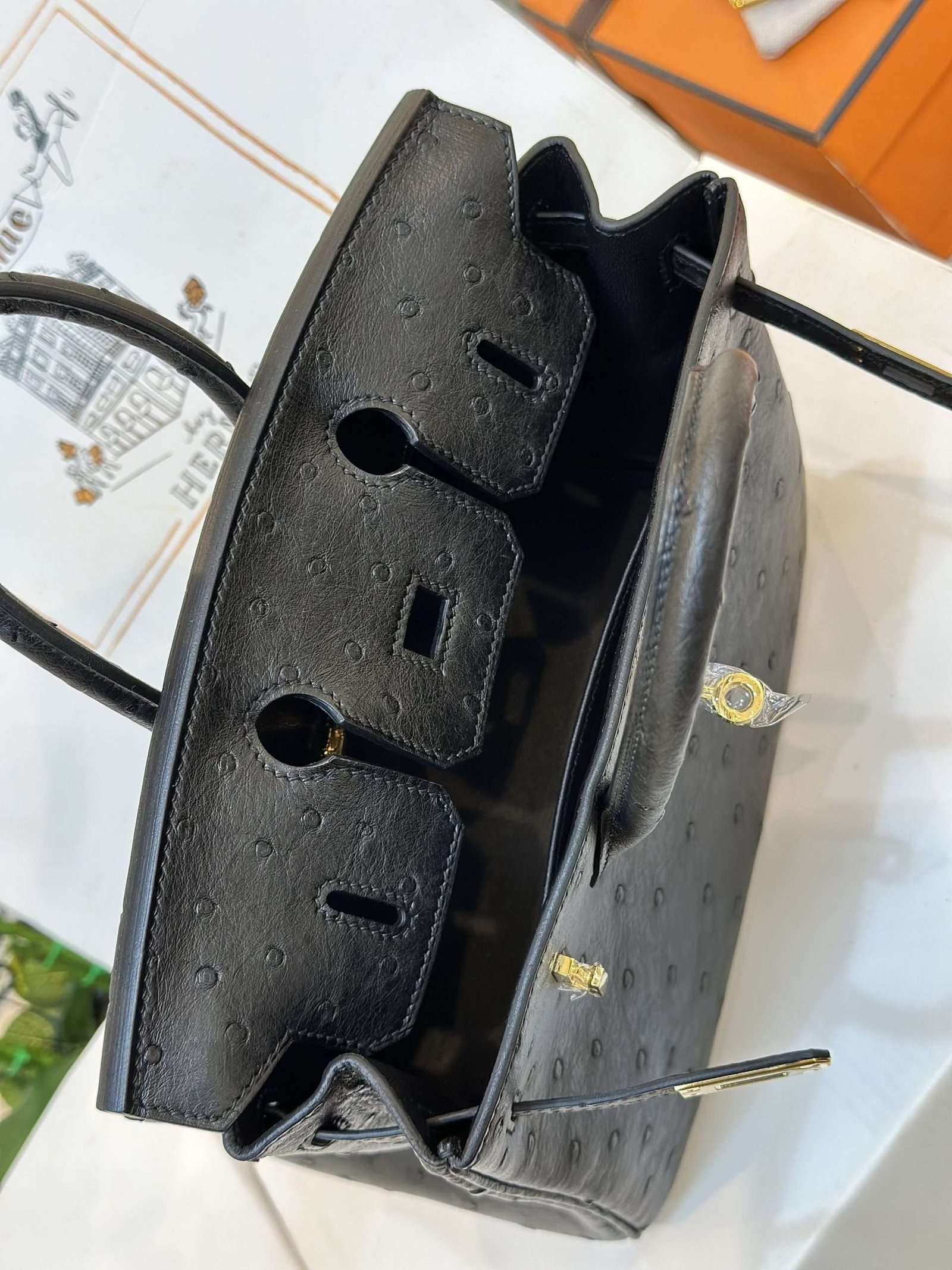 Hermes Birkin Ostrich Leather Handbag Black Lock Gold 25cm - LuxuryRepBags