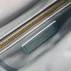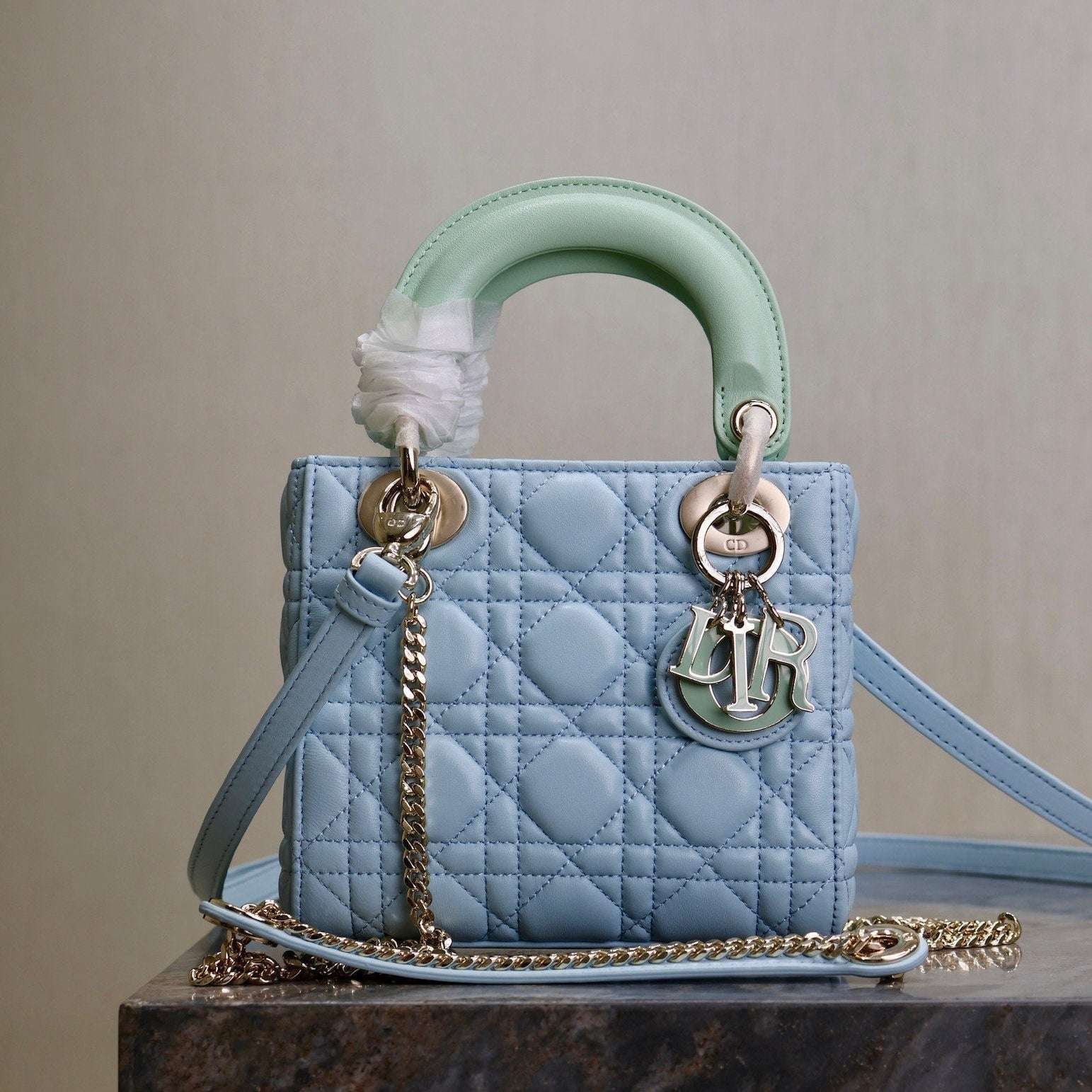 MINI LADY BAG 17 IN BABY BLUE QUILTED MACROCANNAGE CALFSKIN GREEN STRAP - LuxuryRepBags